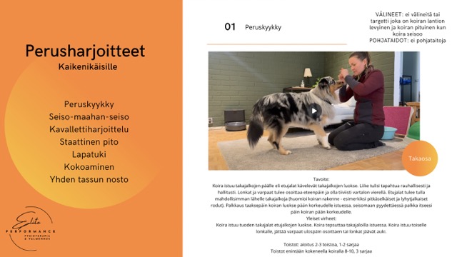 Materiaali on tarkoitettu yleiseksi tiedoksi ja tueksi koiran hyvinvoinnin ja harjoittelun edistämiseen. Se ei korvaa eläinlääkärin tai fysioterapeutin tekemää tutkimusta tai yksilöllisiä ohjeita. Harjoittele aina huomioiden koirasi yksilölliset ominaisuudet, tausta sekä mahdolliset eläinlääkärin ja fysioterapeutin ohjeet.